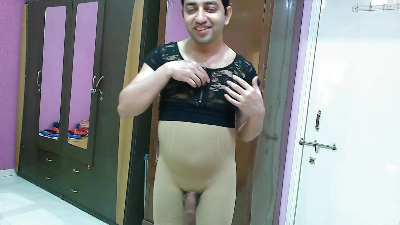 . Hot sissy crossdresser femboy pmb in nude color shapewear and black zipper crop top, playing and masturbation with his big dick from the hole of the shapewear and showing his ass line as well.
