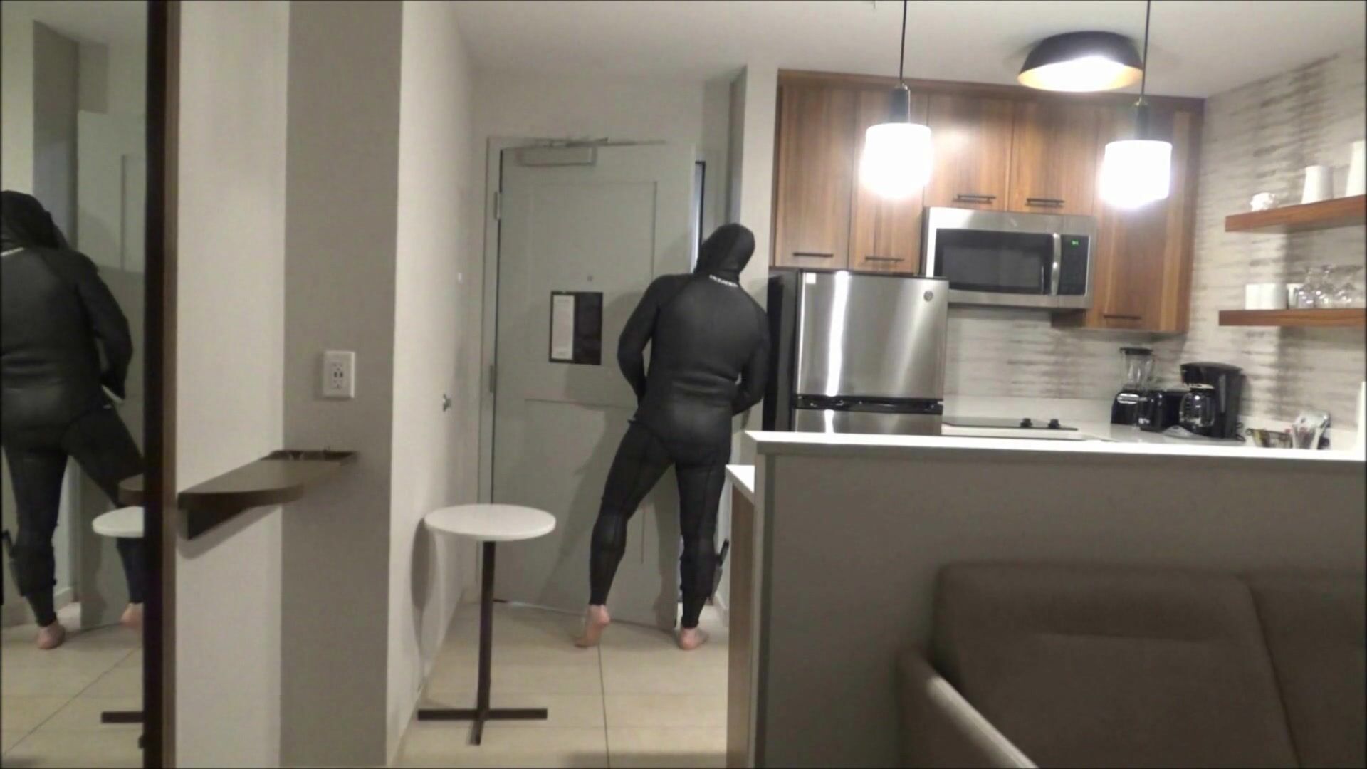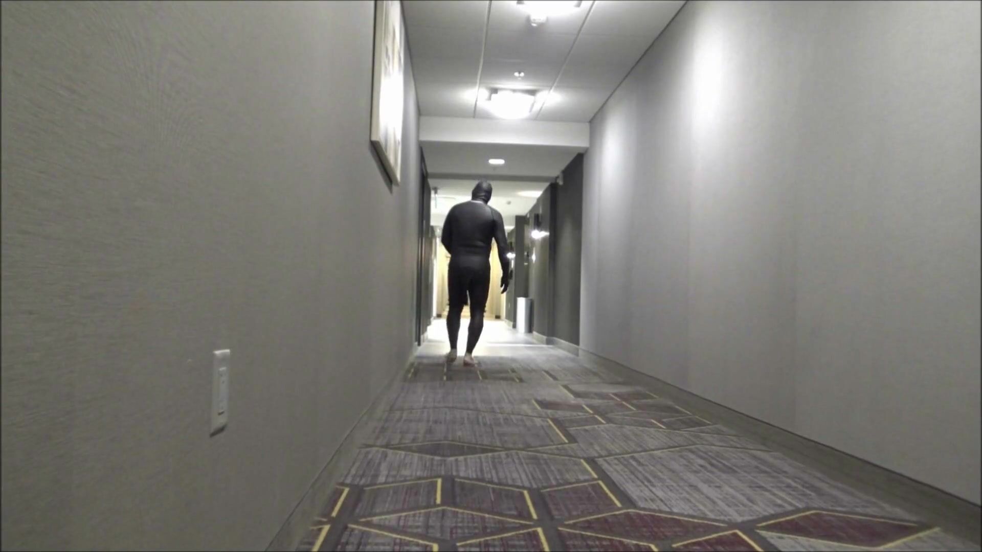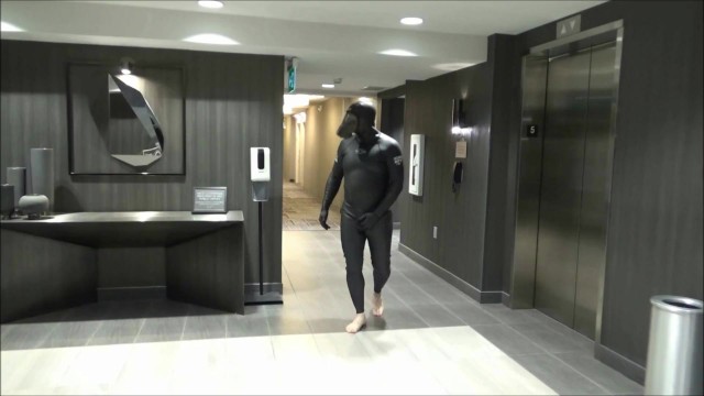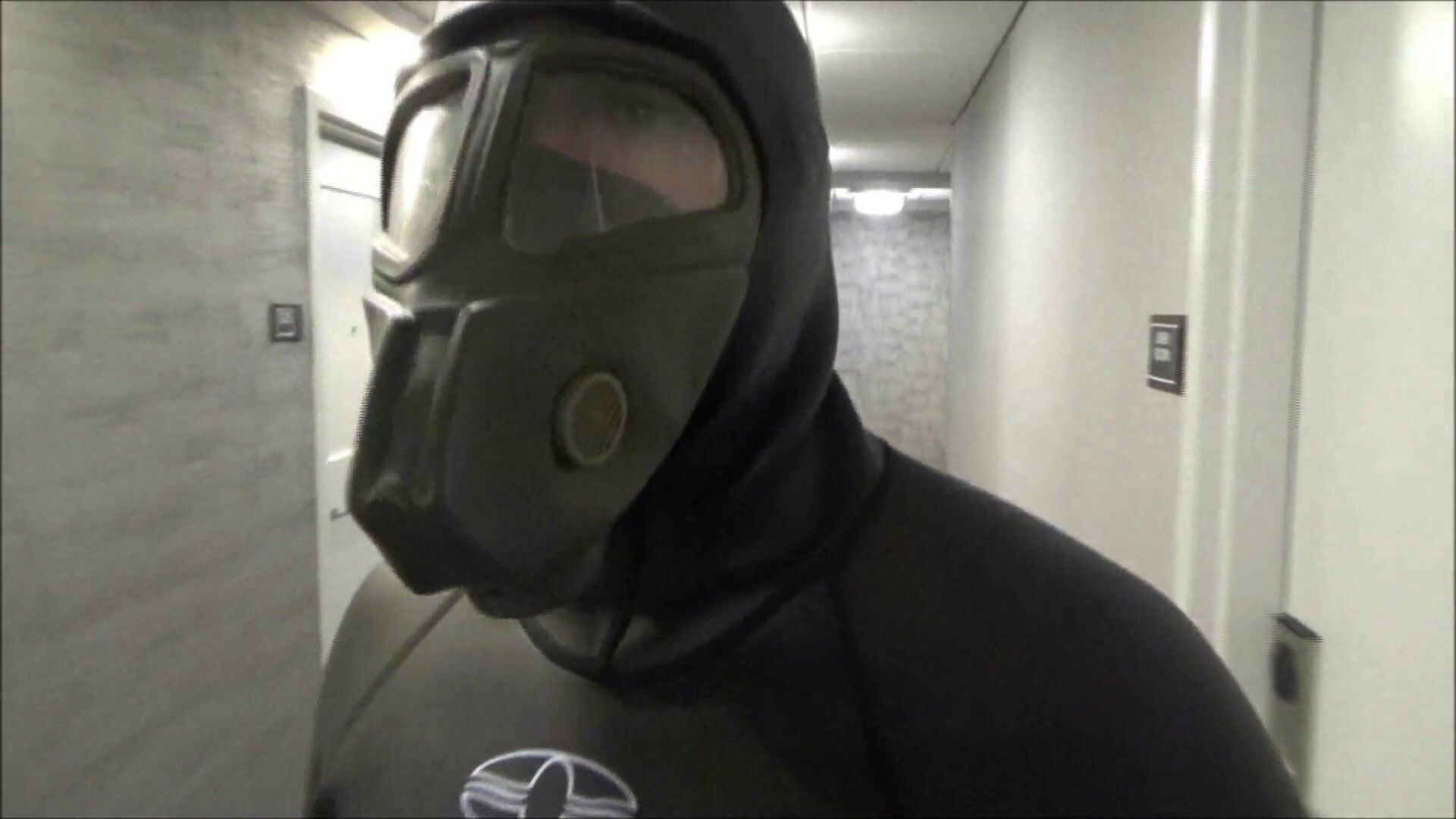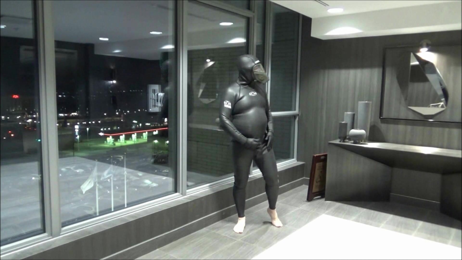 HOTEL MOVIE PART 6 - CHANGED INTO NEW WETSUIT & GASMASK FROGMAN CUMS AT ELEVATOR WINDOWS