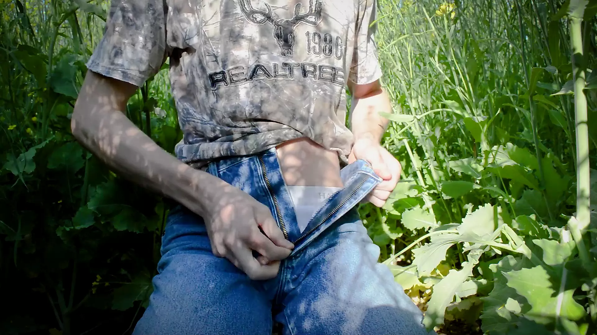 . Watch the farmers son hide in daddys field to check himself off beneath the tall canola plants. While wearing jeans he strips off his shirt and begins stroking his well hung cock.