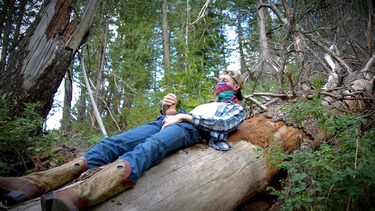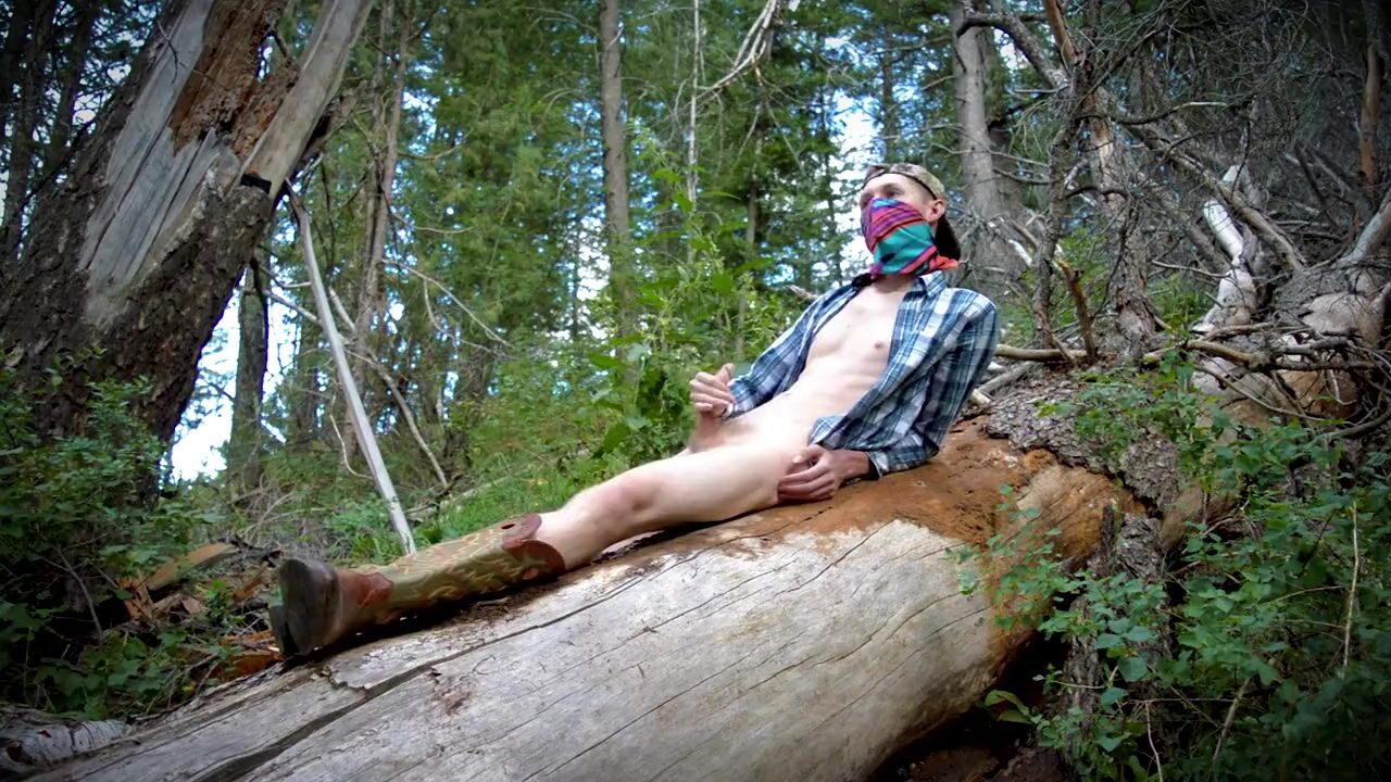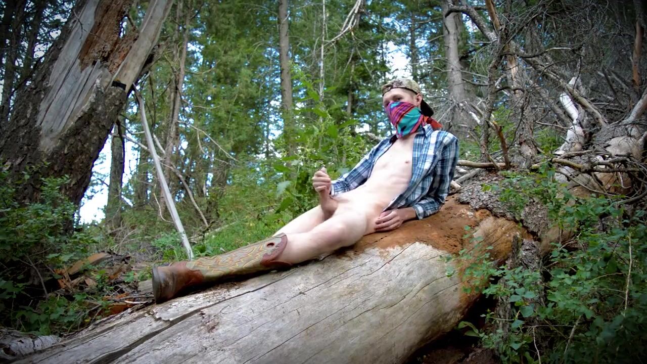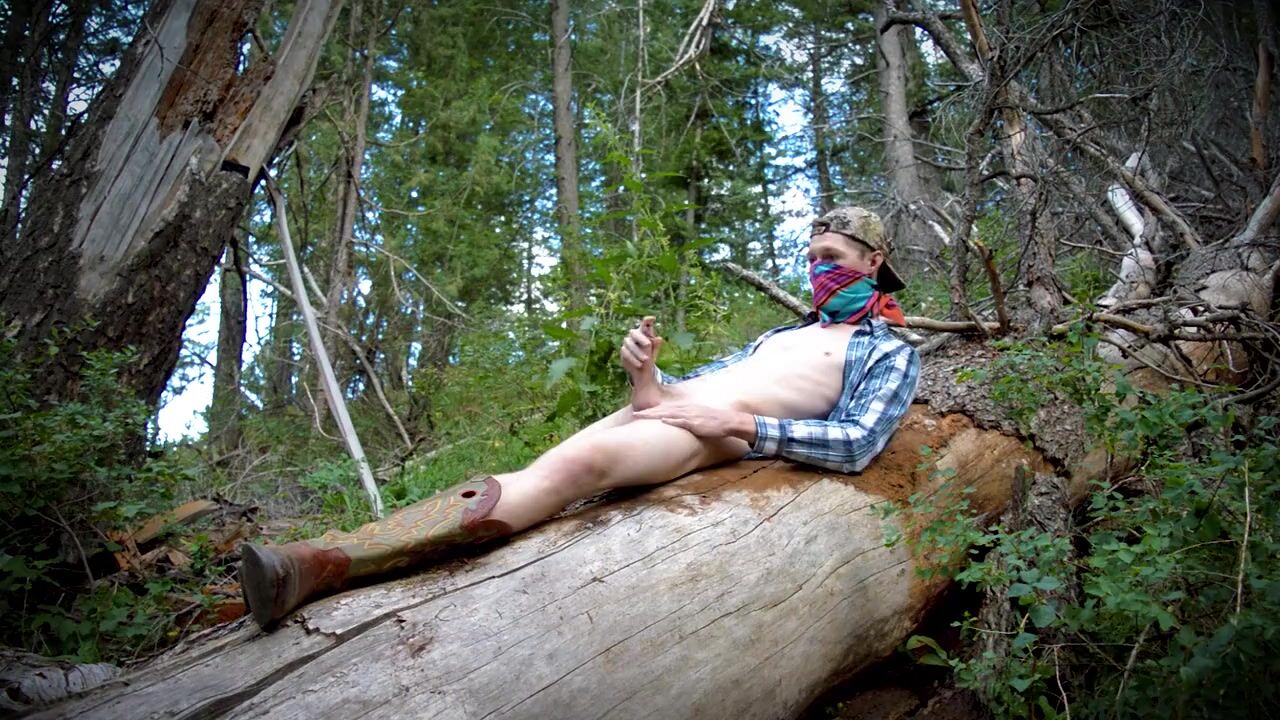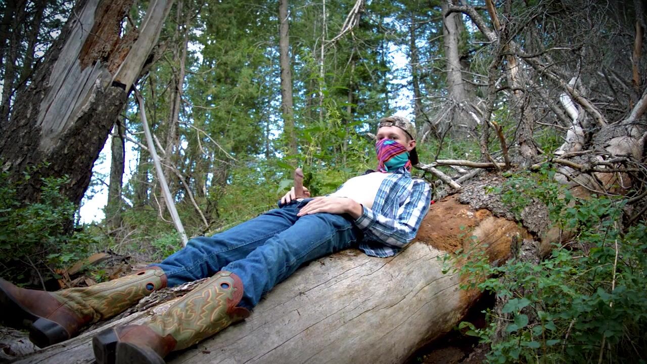 . This country boy jacks off on a fallen tree in the middle of a public forest. First he strips off his blue jeans, puts his cowboy boots back on, then goes to town rubbing and wanking his engorged cock