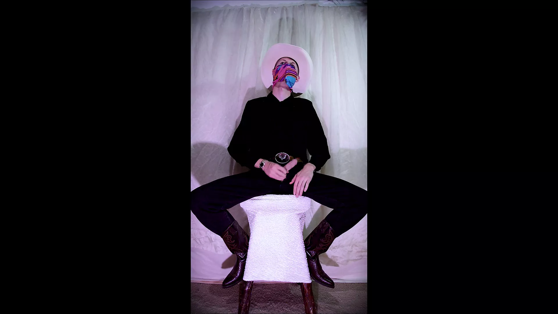 . This western robed cowboy strokes his stiff cock hard while sitting on a bar stool. After a while of stroking his burning ember he squirts his cum all over himself. All while his roommates in room.