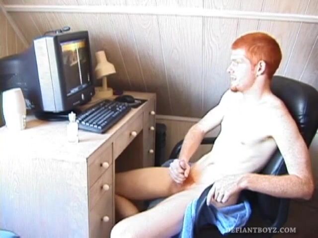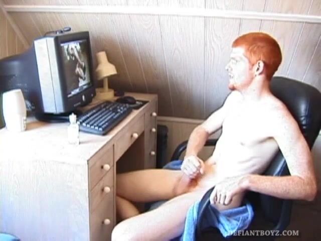 . Seated in front of the computer, Tristian pulls out his cock, lubes it up and starts jacking off to the porn video playing. After showing us his butt, and working himself to the edge, Tristian pumps h