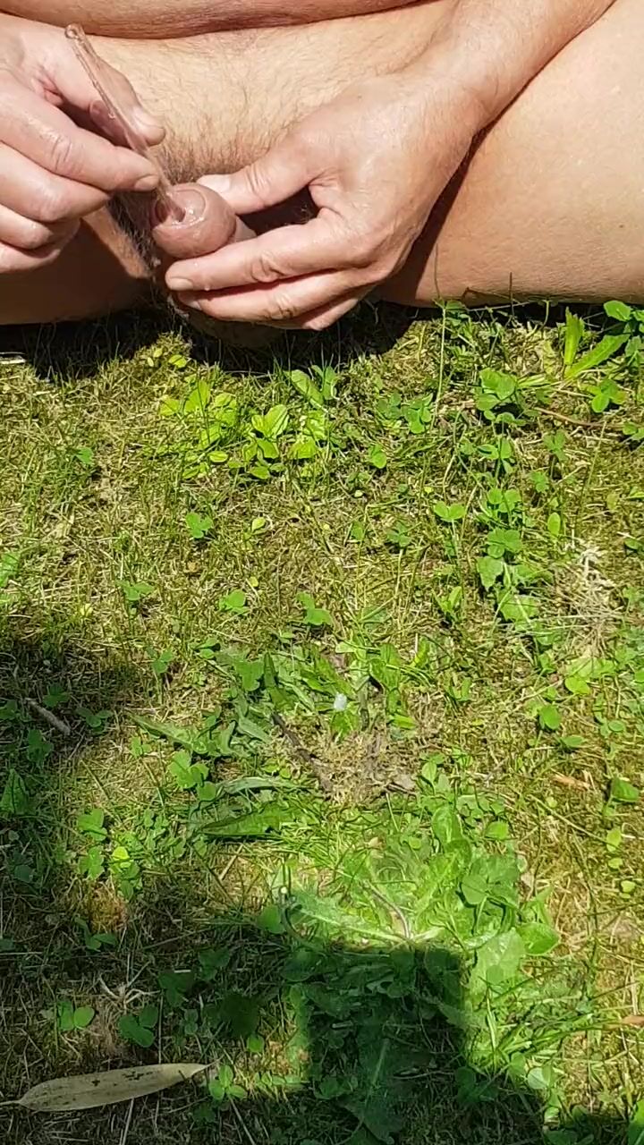 . Outdoorplaying with my penis and a glastube
