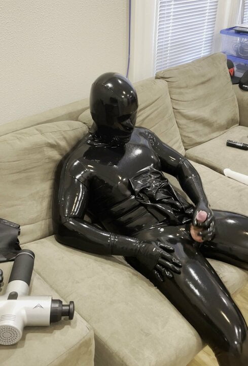 . Fully covered rubbergimp big cum on latex hood