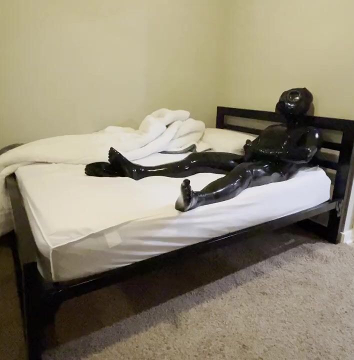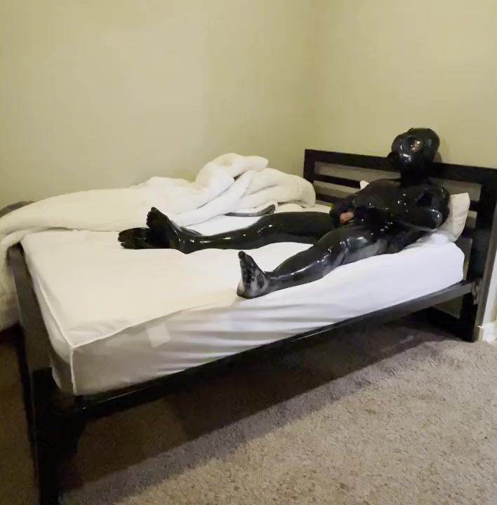 . Fully-covered gas mask rubbergimp wank and cum