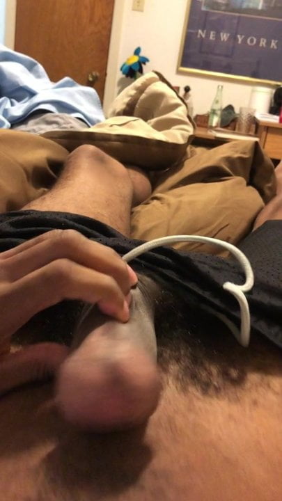 . Pressing, stretching, and twisting the remnants of my frenulum to vigour cumshot.