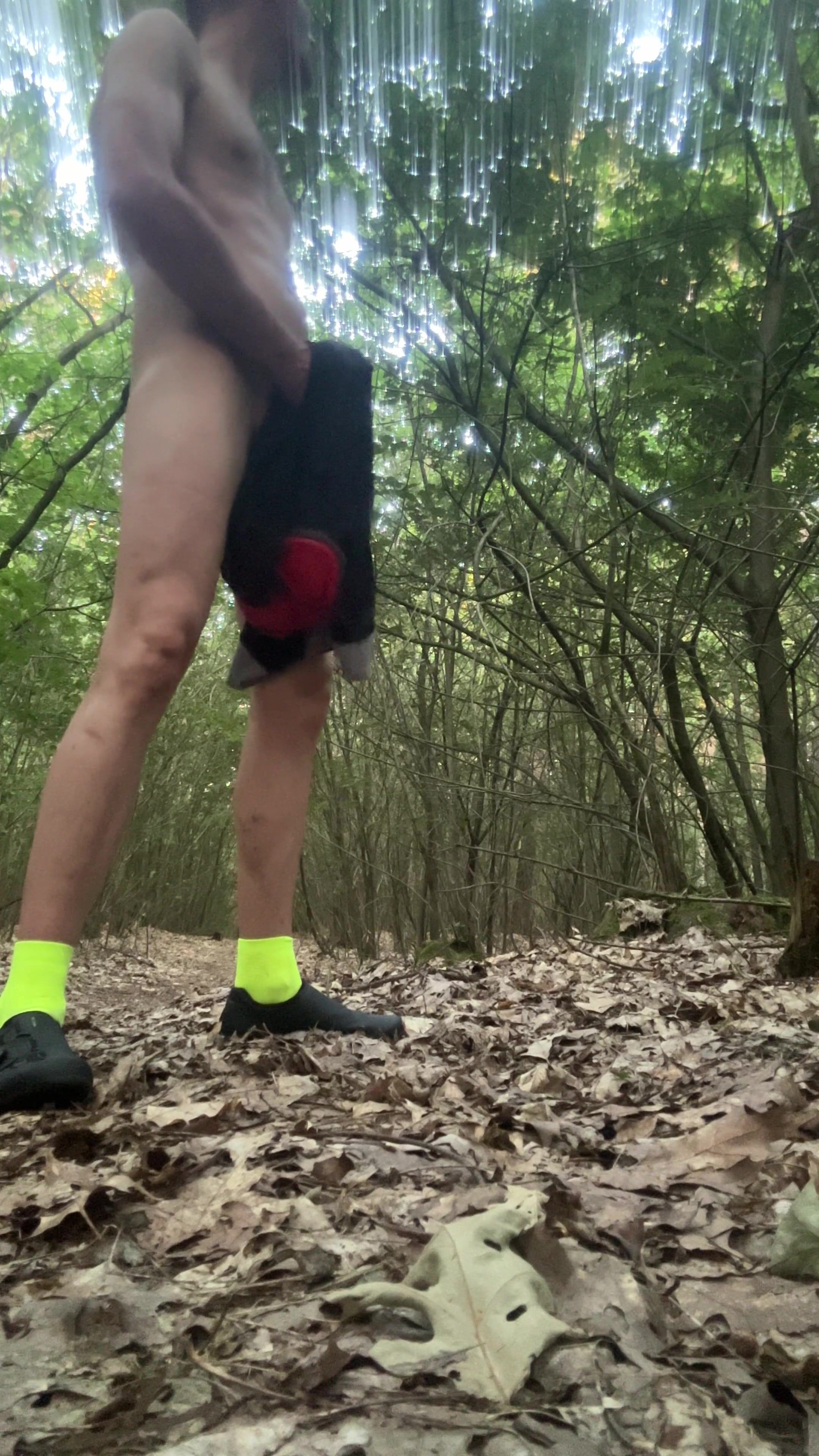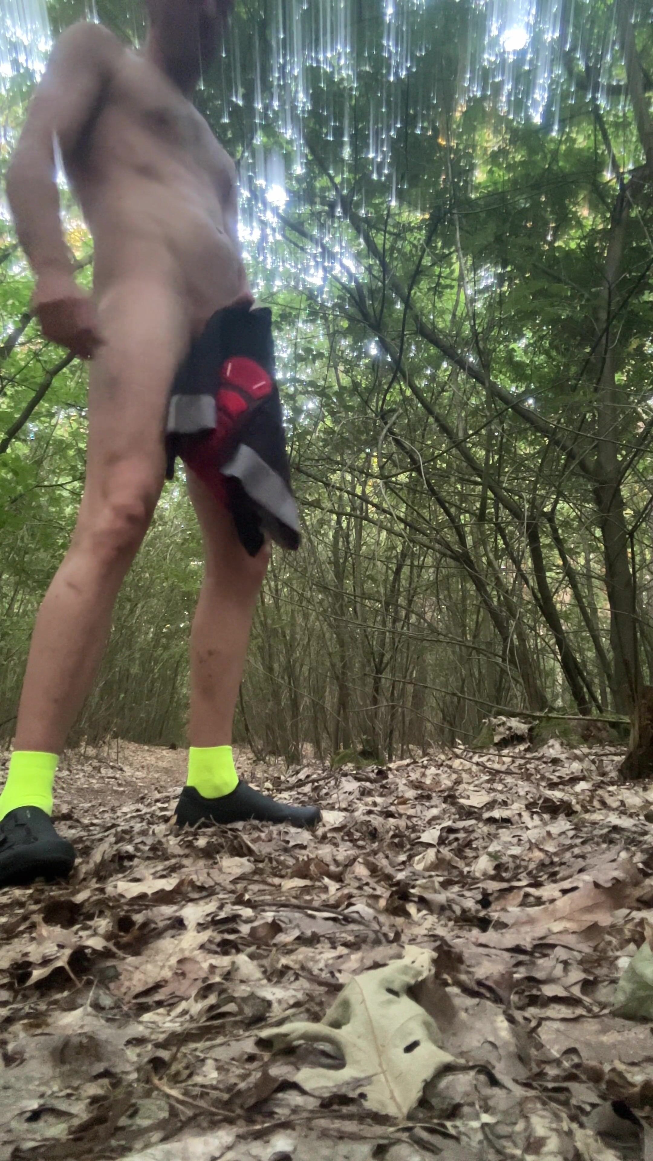 NAKED OUTDOORS DURING A CYCLING RIDE JERKING OFF AND CUMMING