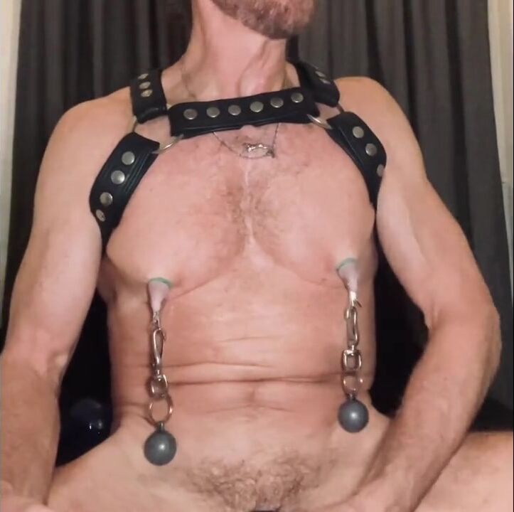 . The two main pleasure zones for this lean leather daddy are his big bullet nips and his hungry hole. Watch him give both a workout in this laid back solo session. With his plump pig tits banded and ready, he attaches a series of weights and clamps and gives them a good stretch...blurring the line between pleasure and pain. Moving to his pink manhole, he then pummels his arse with some of his favourite toys...even doing a double feed to get his hole sloppy and gaping...and ready for the fisting that has been lined up for later that night...