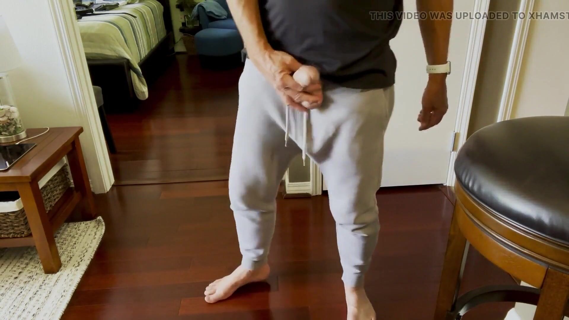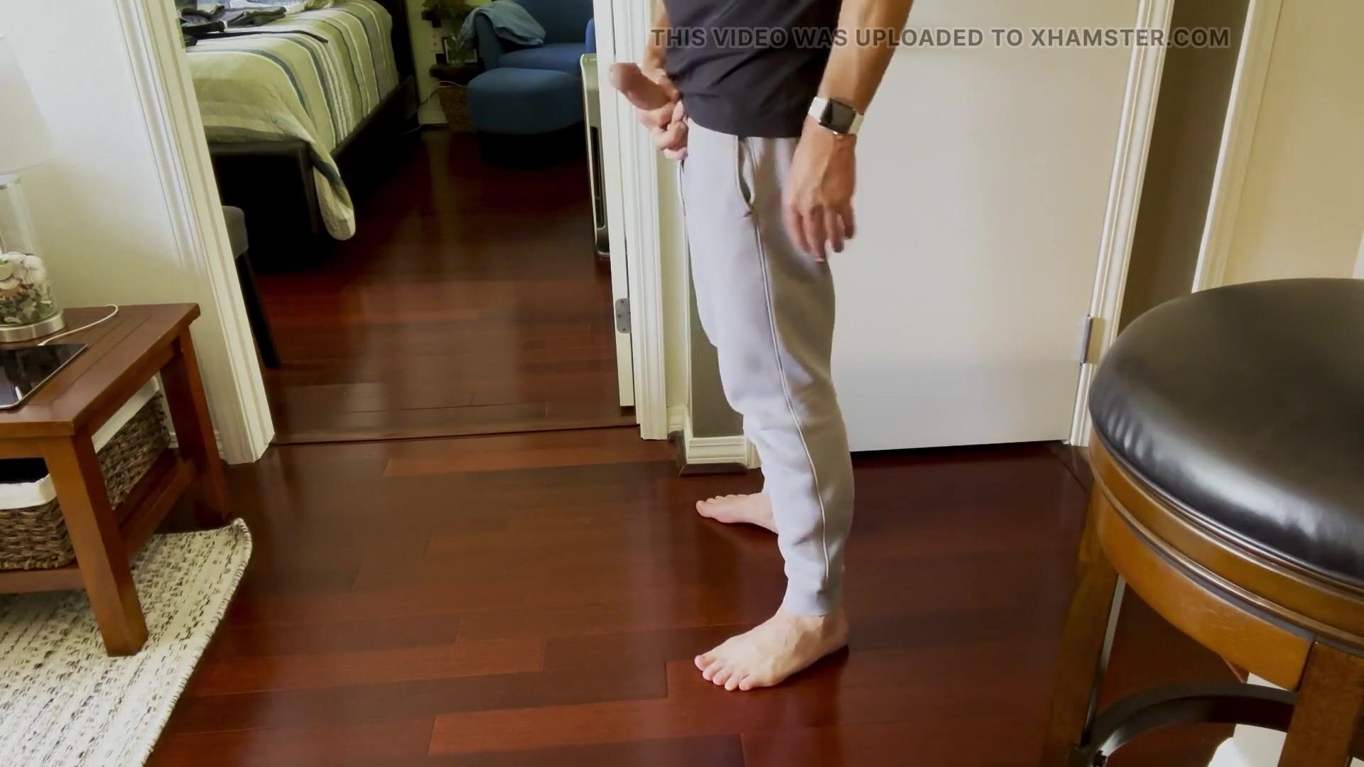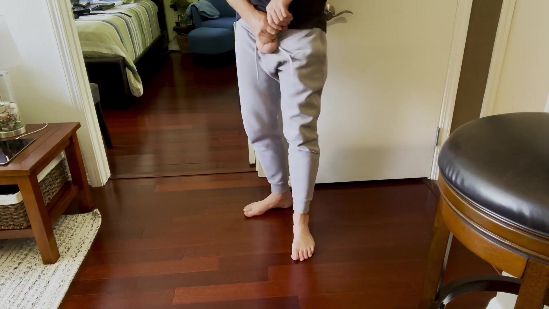 . Standing barefoot in gray sweatpants with an impressive dick bulge and taking out my pretty dick to show it and stroke it for you.