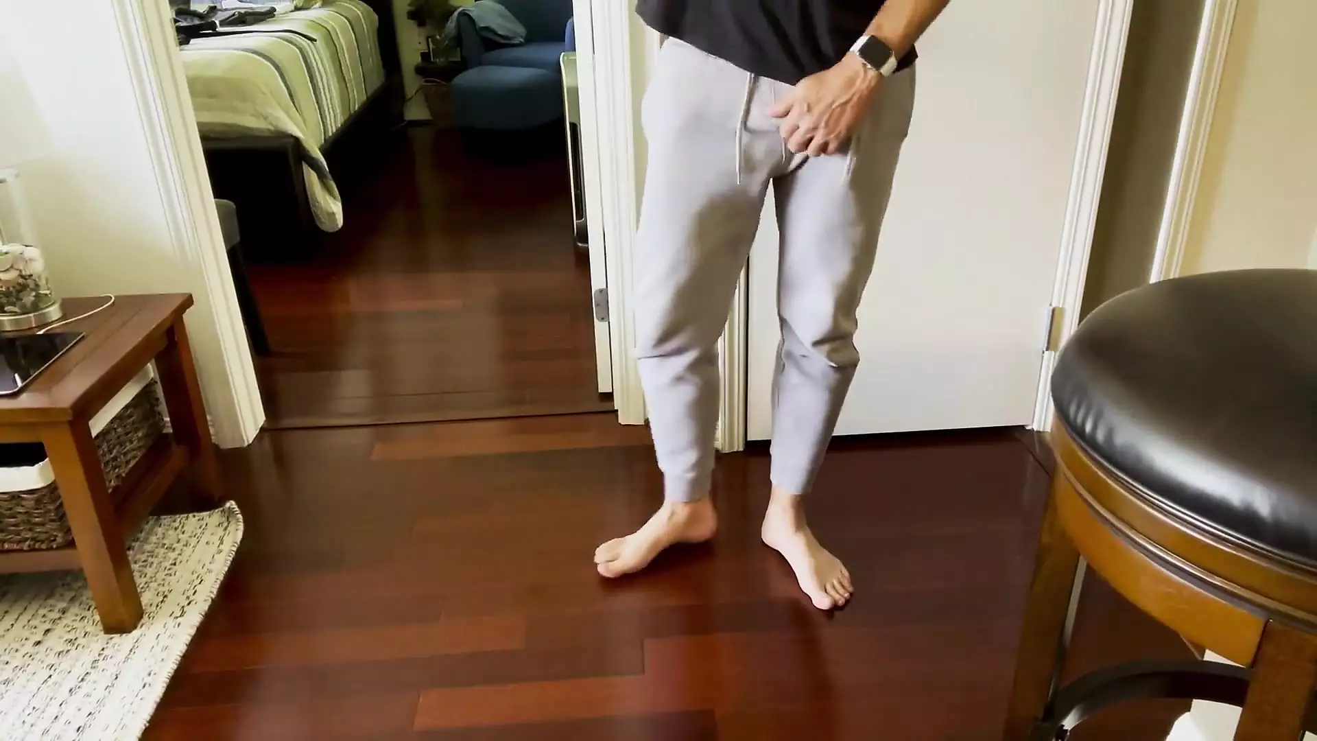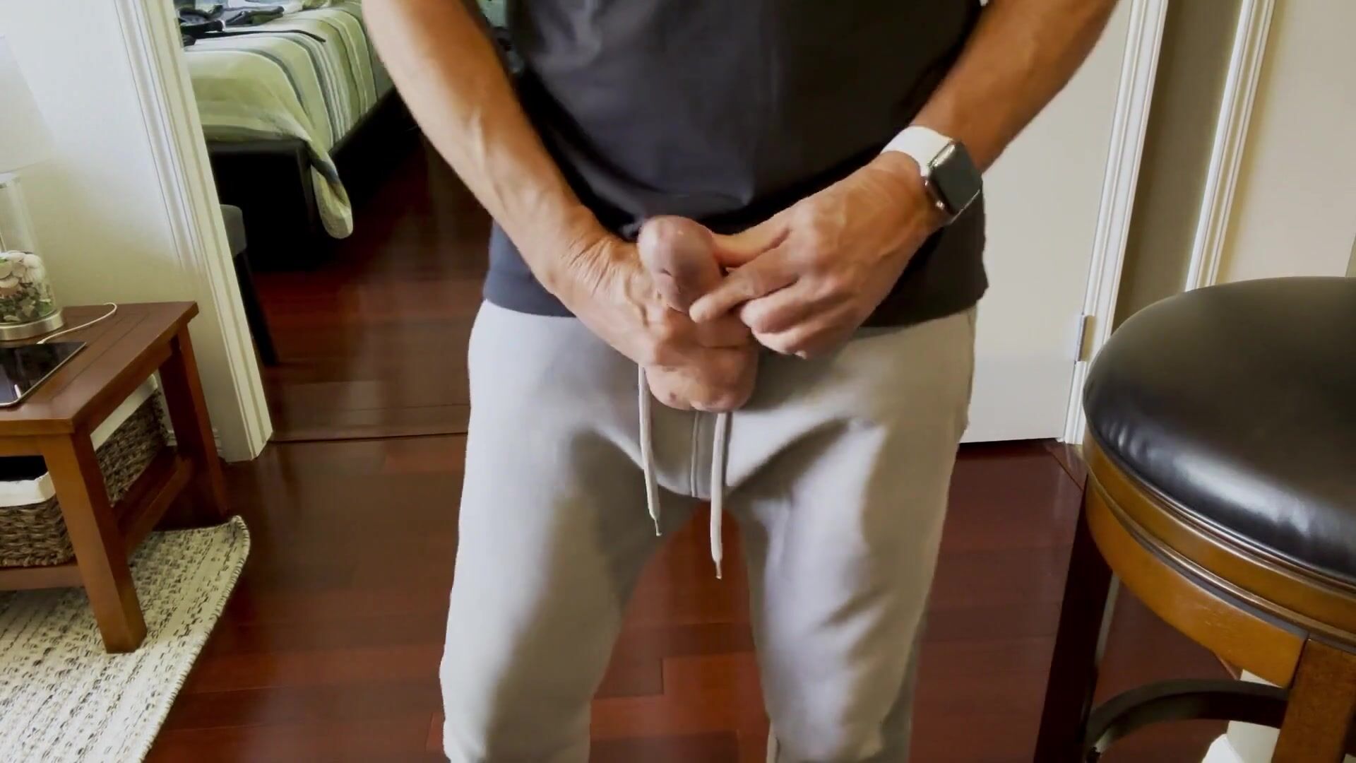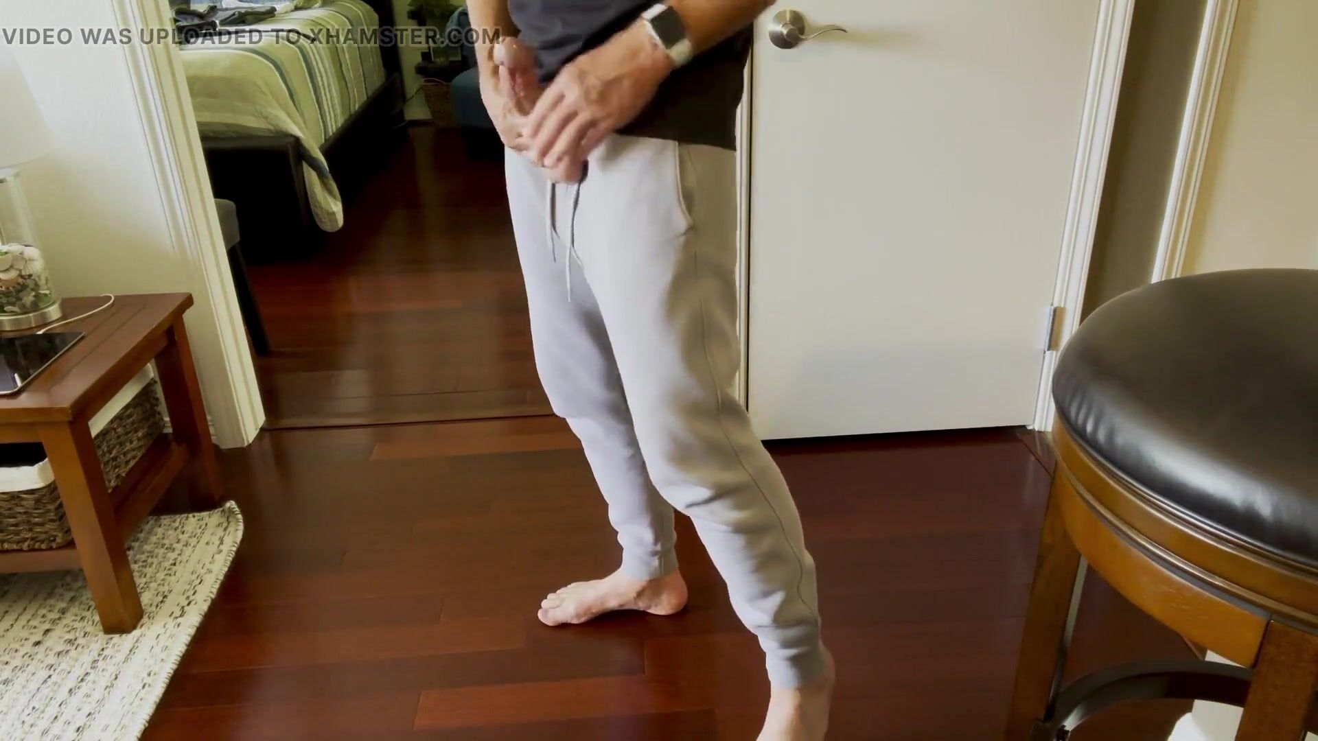 . Standing barefoot in gray sweatpants with an impressive dick bulge and taking out my pretty dick to show it and stroke it for you.