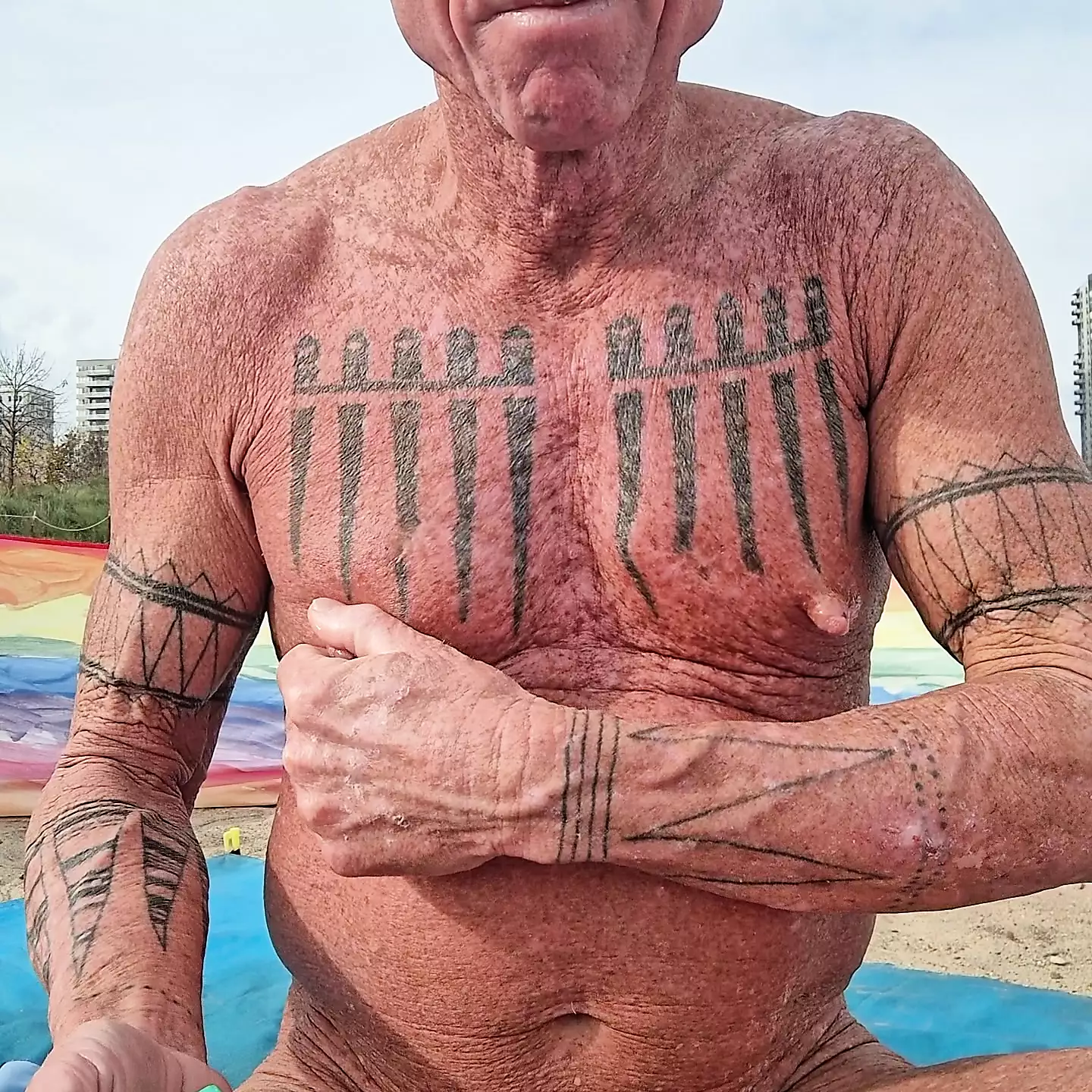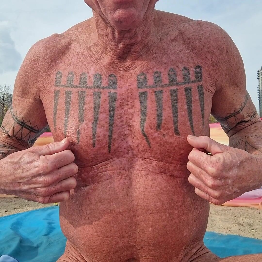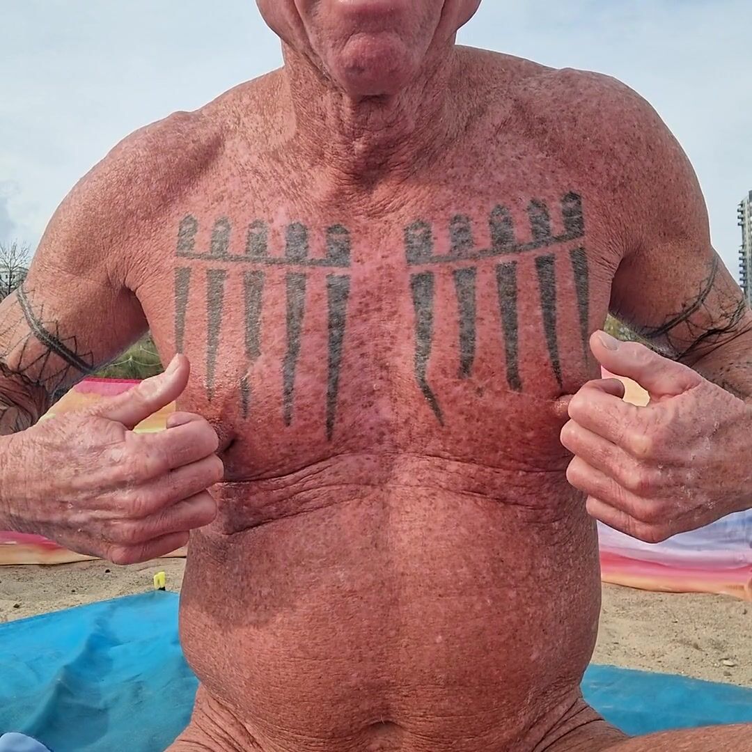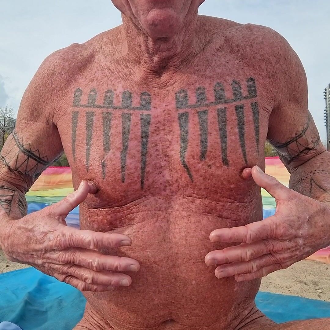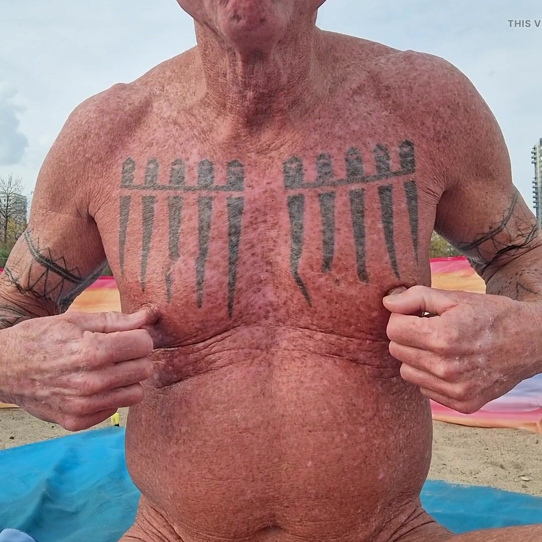 . Tugging, pulling, twisting and massaging my nipples at the beach