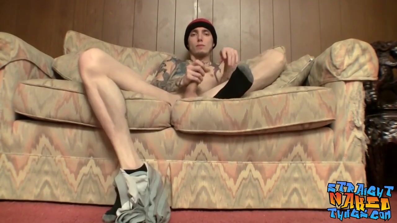 STRAIGHT INKED THUG JACKS OFF HIS HARD DICK AND SPRAYS CUM