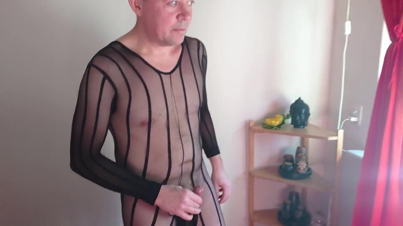 . I dress up in a sexy black nylon body stocking and light pink thigh highs and a pair of hot high heeled shoes and play with my hard cock. One can see it all from outside through a window.
